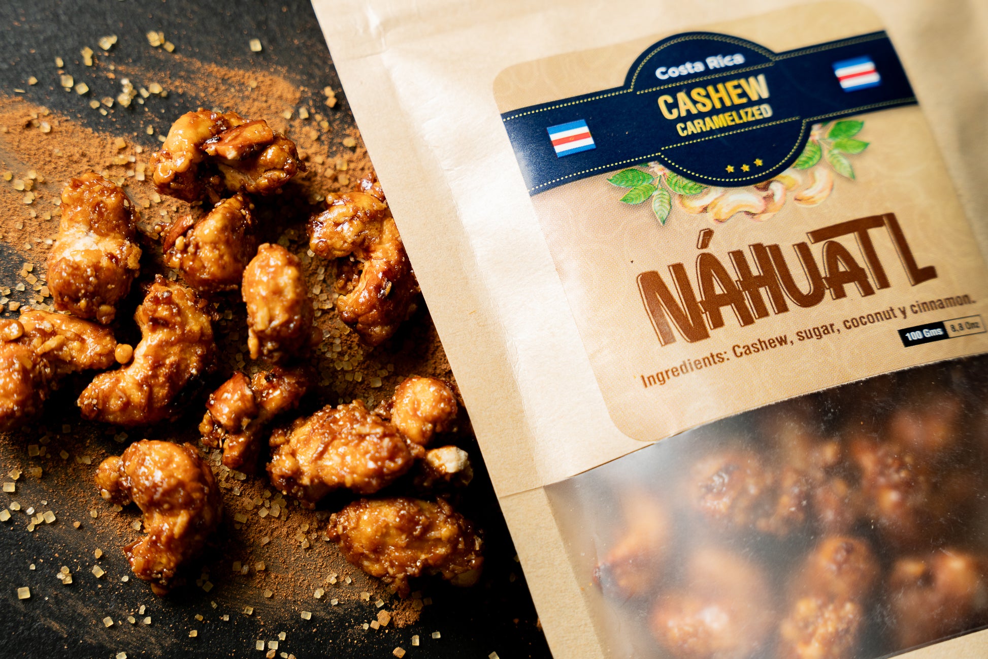100 gr bags. Indulge in our premium caramelized cashews, perfectly roasted and coated with cane sugar, cinnamon and coconut Each cashew is carefully selected for quality and slow-roasted to achieve the perfect crunch. The sweet caramel coating creates an irresistible combination of nutty and sweet flavors that makes these cashews the perfect snack for any occasion.